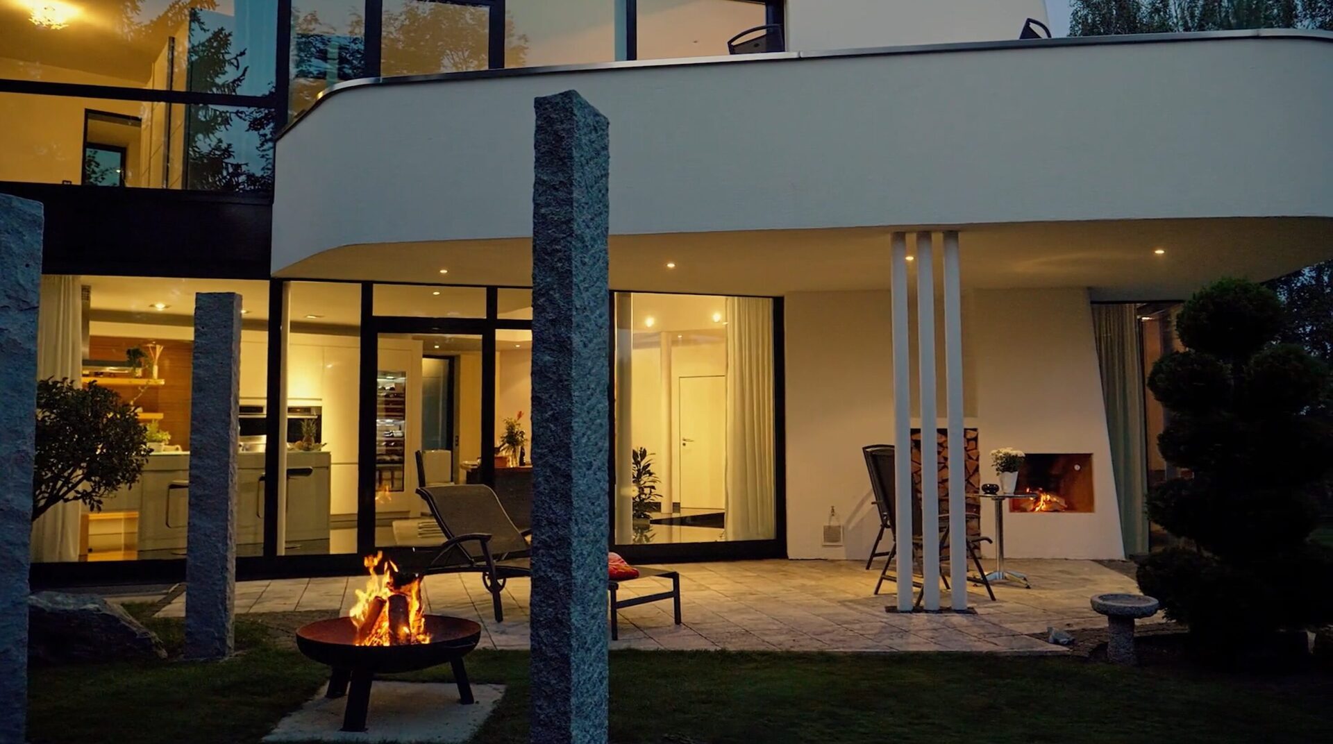 Ein besonderes Highlight ist der Sauna Cube im Außenbereich, der mit einem eigenen Ruheraum für pure Entspannung sorgt. Die moderne Smarthome-Steuerung, eine hochwertige Einbauküche von Leicht mit Geräten von Miele sowie eine Sicherheitsanlage mit Video-Toranlage und aufgeschalteter Alarmüberwachung bieten höchsten Komfort und Sicherheit.