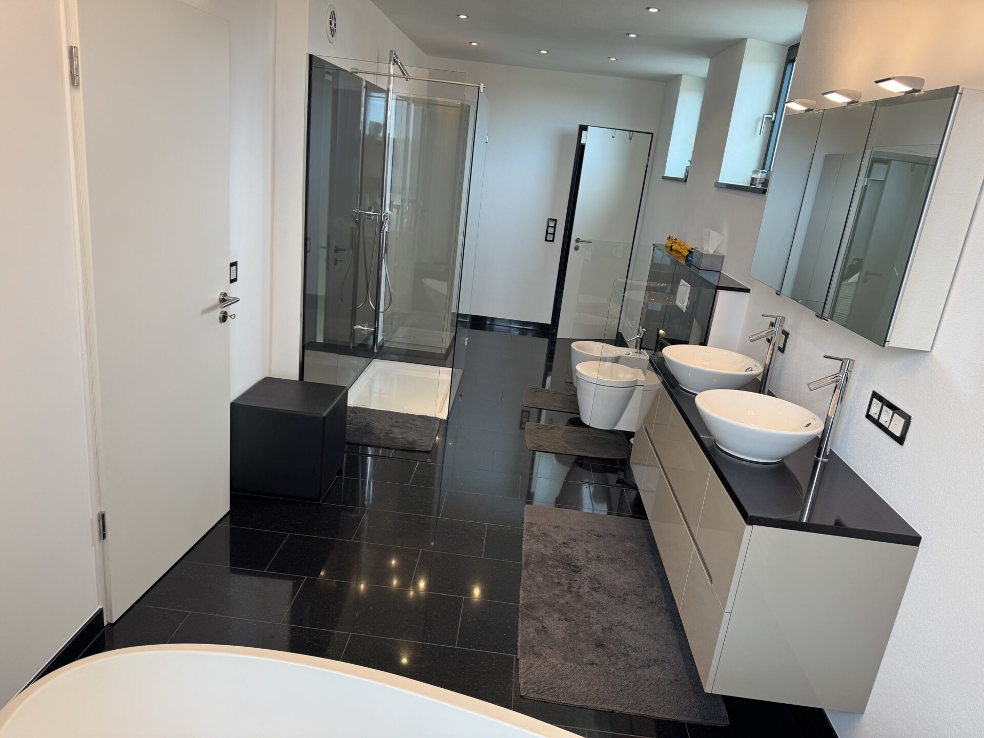 Weitere Highlights: Doppelgarage mit direktem Zugang & Wallbox-Vorrüstung, Wäscheabwurfschacht, Schallschutztüren in Schlaf- und Gästezimmer für vollkommene Privatsphäre.