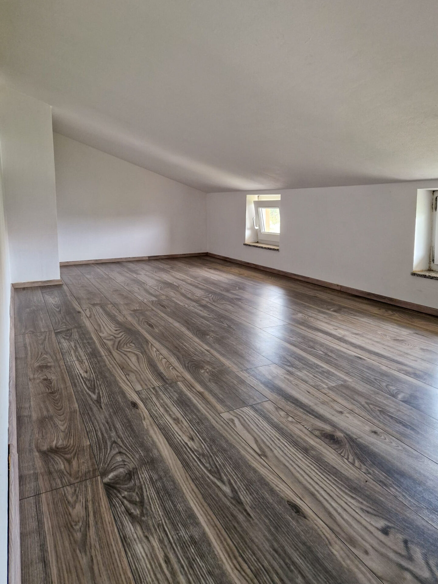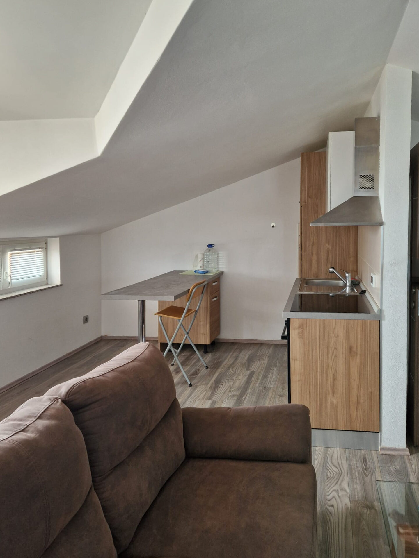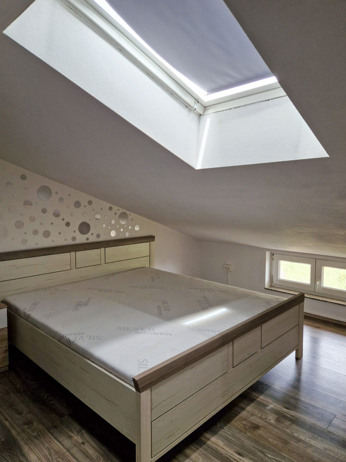 Die Wohnung verfügt über insgesamt vier Räume, wobei ein Zimmer aufgrund der ausgeprägten Dachschräge als Abstellraum genutzt wird. Die übrigen Räume sind durchdacht geschnitten und mit Laminat- und Keramikböden ausgestattet. Große Fenster mit 2-Schicht-Verglasung, Stoffjalousien und Moskitonetzen sorgen für angenehmes Tageslicht und Komfort.