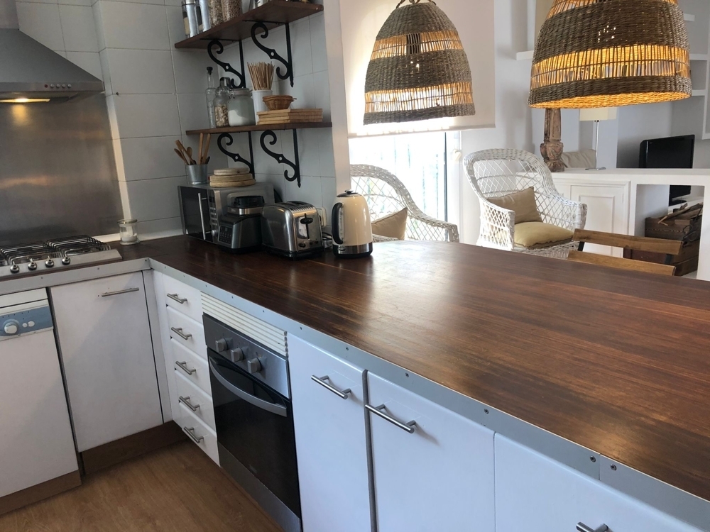Offene Einbauküche mit eleganter Teakholz-Insel