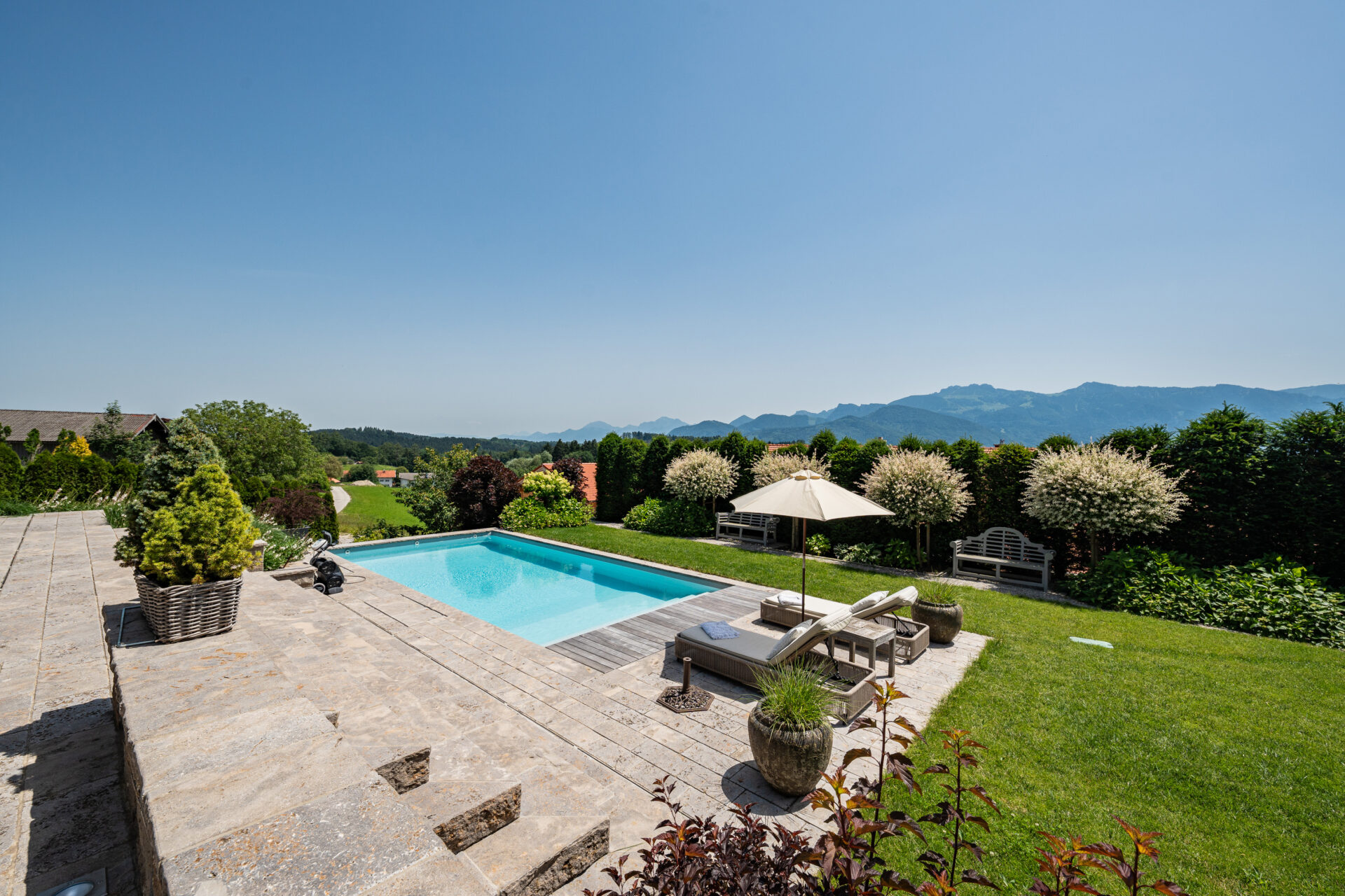 Besonders erwähnenswert ist, dass der Aufwand betrieben wurde das Hanggrundstück so zu terrassieren, dass ein großer Pool Platz fand und durch intelligente Bepflanzung sich das Alpenpanorama frei eröffnet.