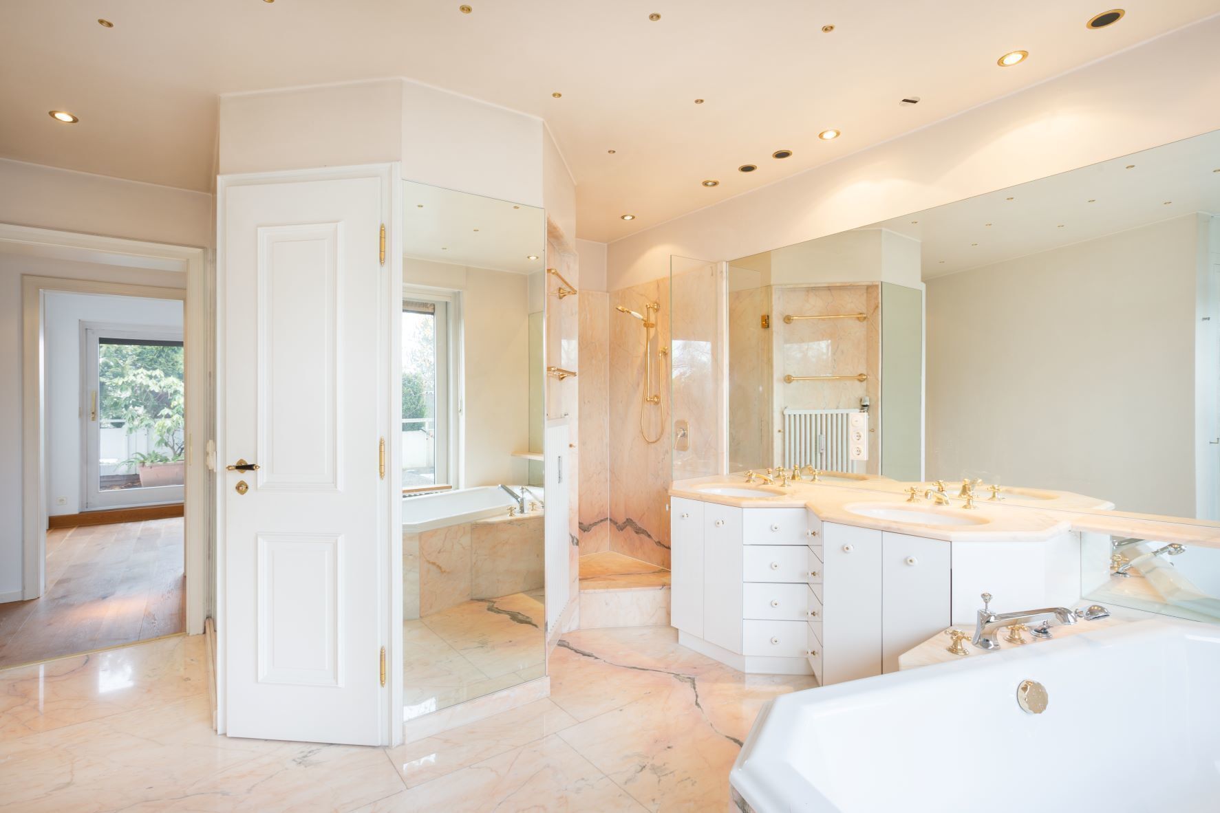 Eine schöne weiße Einbauküche, ein separates Gäste-WC sowie ein praktischer Hauswirtschaftsraum bieten zusätzlichen Komfort. Das elegant mit Marmor ausgestattete Bad unterstreicht den hochwertigen Charakter der Wohnung.