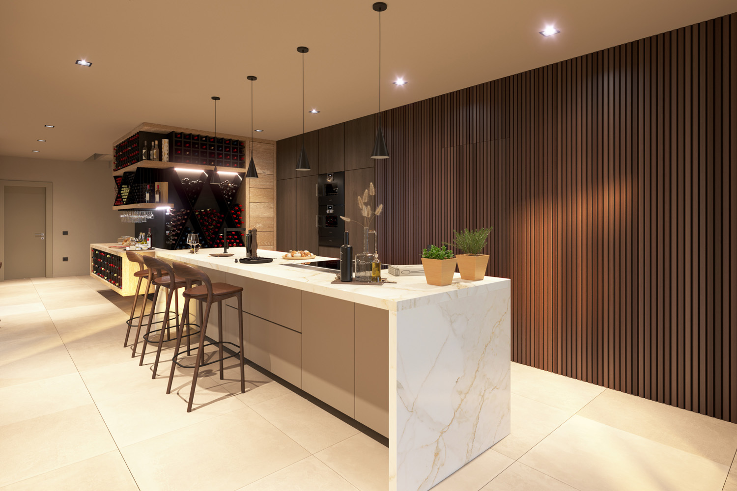 Im Obergeschoss befinden sich drei weitere Schlafzimmer, jeweils mit en-suite Badezimmer, darunter auch das luxuriöse Masterzimmer mit freistehender Badewanne – private Rückzugsorte mit Stil und Komfort. Als besonderes Highlight gilt die großzügige Dachterrasse: Sie eröffnet einen traumhaften Panoramablick bis hin zu den Alpen und dem Adriatischen Meer – ein exklusiver Ort, um im Whirlpool den Sonnenuntergang zu genießen.